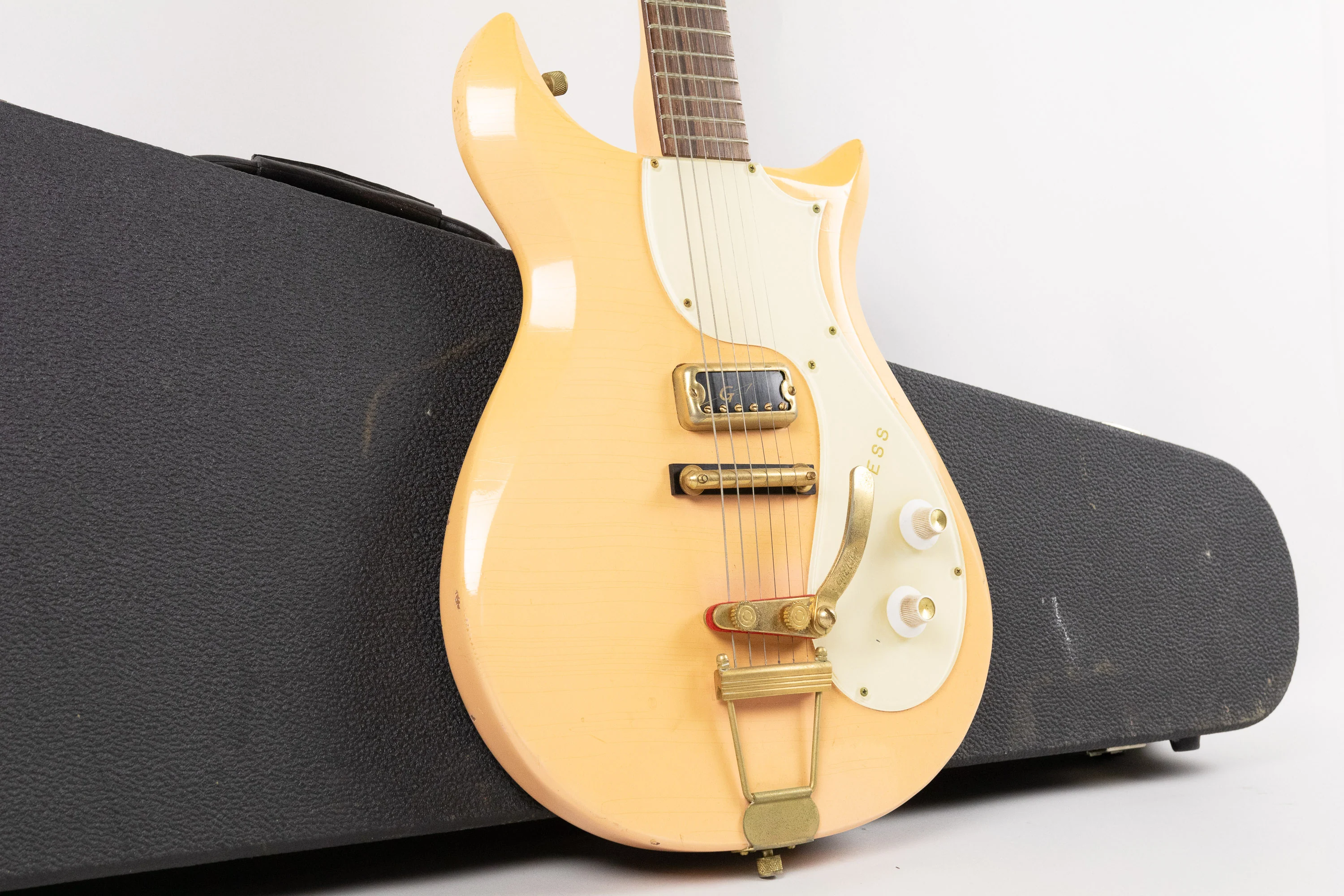 This original finish pink/white pickguard example is the rarest of all colours the Princess model was available in, the other finishes being white w/grape guard, white w/gold guard and blue w/white guard.