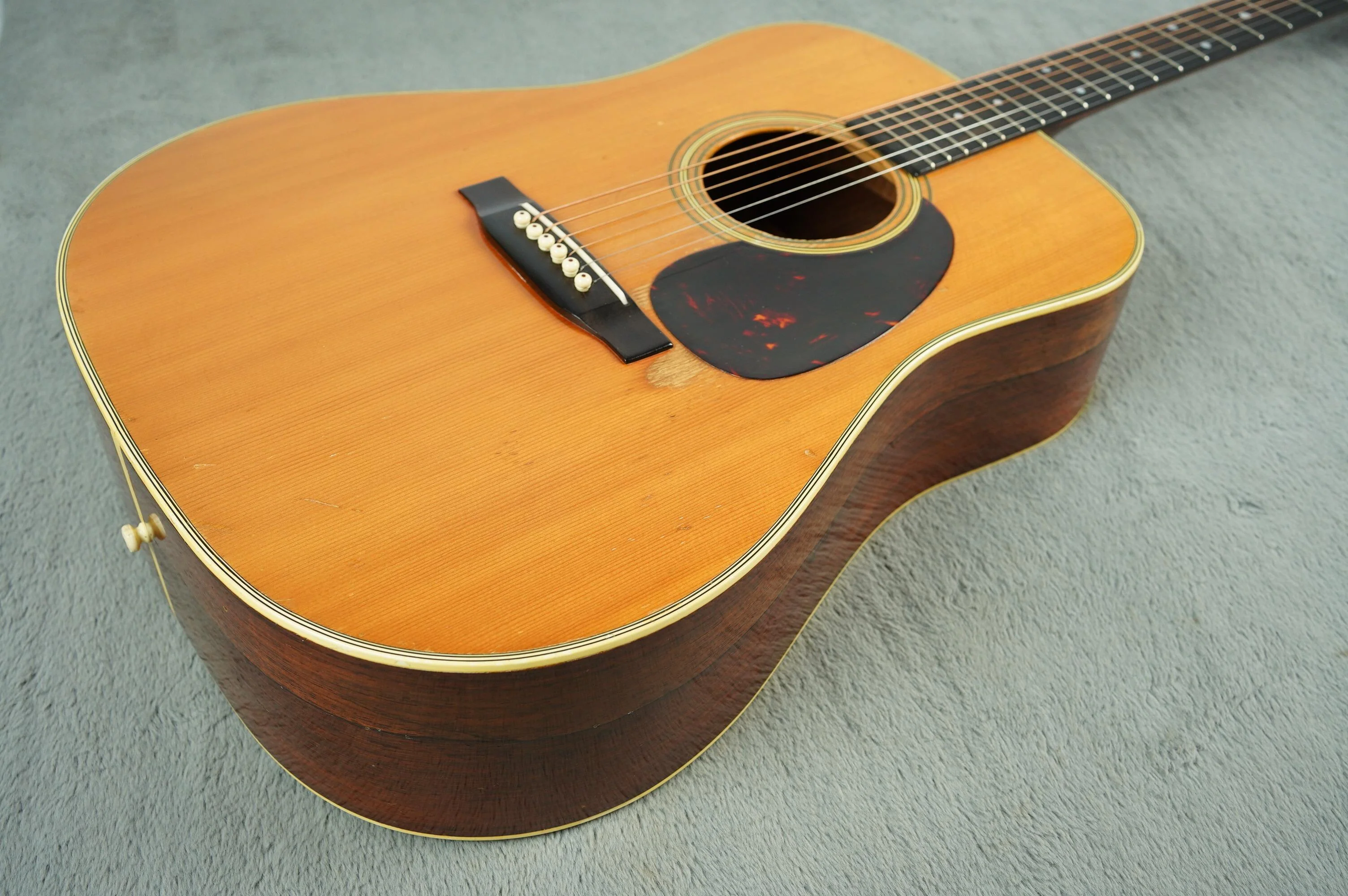 Tuners are later Grovers that provide very good tuning stability. There are holes visible from previously installed repro Waverley's as well as holes to the heel from previous strap buttons. There's a cleated crack around the lower side rim otherwise the instrument is original and in good overall condition. It's an excellent looking guitar with characterful wear around the tortoiseshell celluloid pickguard. The Spruce top has aged and darkened nicely and there's an attractive straight grain to the Rosewood.